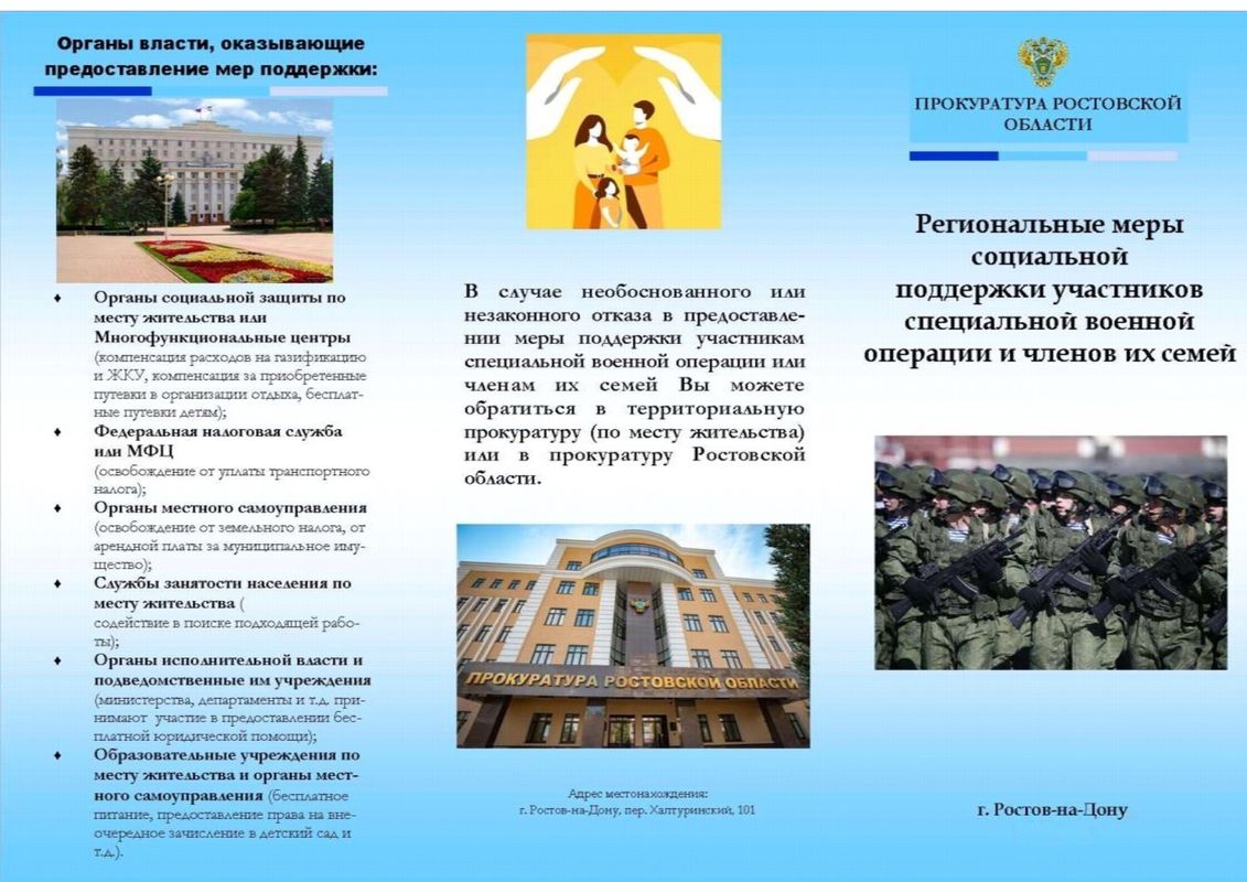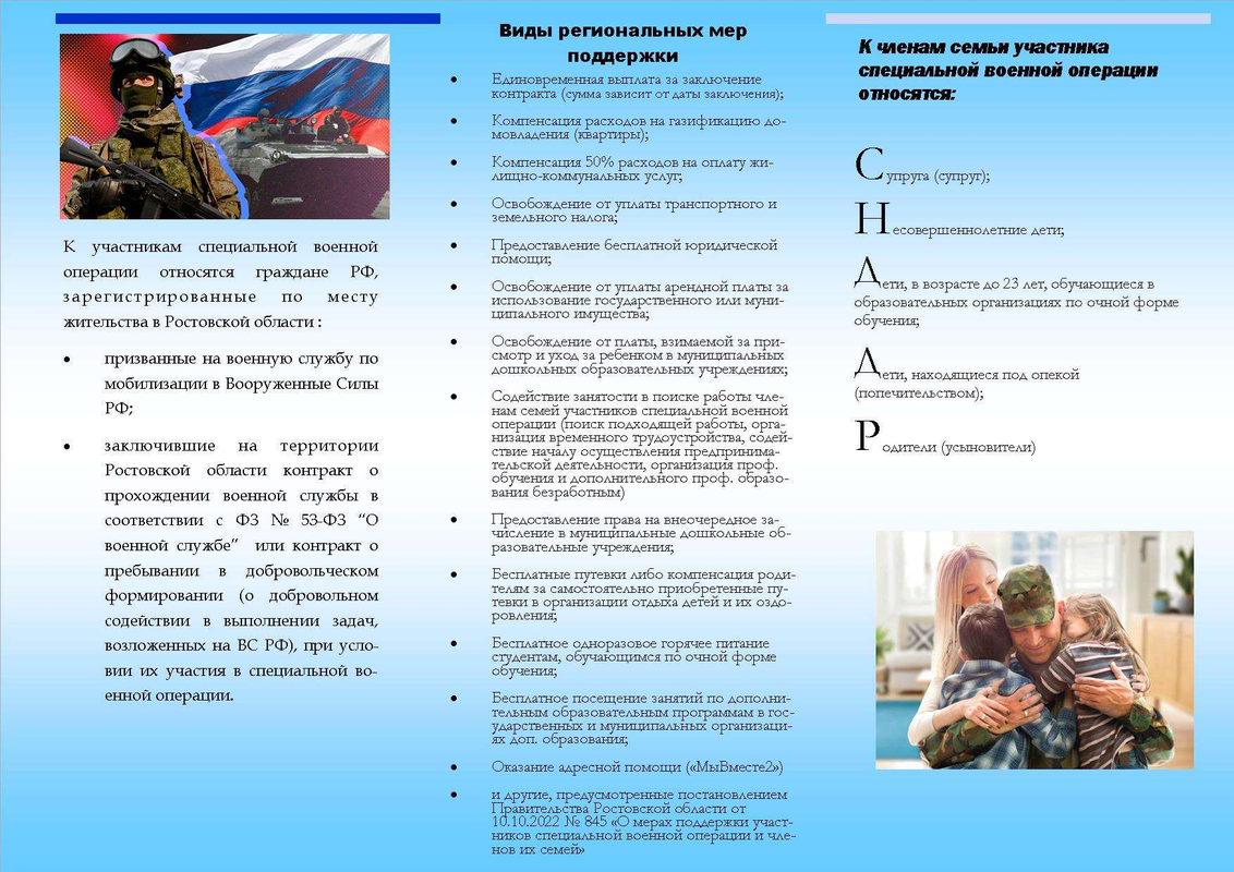 В соответствии с Постановлением Правительства Ростовской области от 10.10.2022 №845 «О мерах поддержки участников специальной военной операции и членов их семей» в Егорлыкском районе для детей участников специальной военной операции придоставляются следующие меры поддержки: